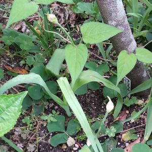 ここと、他の場所に同じ蔓系が生えてきてまして……草? アケビ(葉が違いますね💦) 食べた後、この辺に種植えたっけ?なんて思いつつ、判明するまで待ってる状態です。 木に登っちゃうと、大変な事になりそうだけど、好奇心が勝ってしまって~(笑)