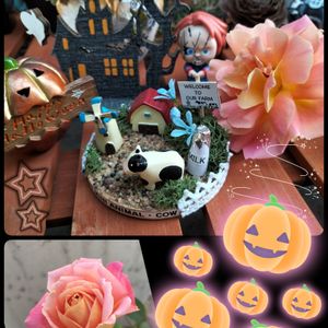 キャー…チャッキーがー現れた🎃 今日は牛さんが狙われてる〜😱 牛さん気をつけて〜💦💦💦 薔薇タヒチは、朝、静かに可愛く開いてました🌹 帰ってきたら…ふわふわパッカーン😆 カットしました✨ ドライにします✨ いい香り〜✨ 🏷牛の日 🏷ダークハロウィン