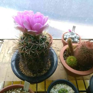 ギムノカリキウム交配種 緋豊玉。 8年位前に伊豆シャボテン公園で購入。 こっちは8分咲き位かな? 平日の昼間は家にいないから、今年は満開見れなそう(^^;)