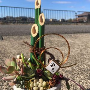 明けましておめでとうございます 本年も昨年同様よろしくお願い申し上げます 12月初めに門松風寄植えワークショップに参加して、やっとお披露目できました🎍 1番はじめに多肉ちゃんとのバランスを考えて門松をたてたはずが、想像していたよりも多肉ちゃんがギュッと刺さり、門松の背だけが高くなってしまいました…。 今は玄関内に飾ってます。 実家の母に「あらっ良いわねっ」と褒めて貰えて嬉しかったです (*´꒳`*) 新しい年が始まったばかりですが、今年の年末は実家にも作ろうかなと思います