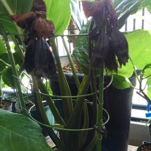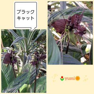 友人の管理するちょうハウスに 珍しい花がさいたよ〜。 とのLINEが入り見てきました。 黒いコウモリみたいな 花で初めて見る本当に 珍しい花でした😳🦇🌼 特徴 ブラックキャットは、黒っぽいユニークな形の花を咲かせ、地下に肥大した地下茎をつくる多年草です。別名バットフラワーにたとえられるコウモリの羽を広げたような部分は苞で、それに包まれるようにつくたくさんの小さな星形のものが花です。花の周囲には、細長い糸状の花をつけなかった花柄(不稔性花柄)が垂れ下がり、まるでひげのように見えます。 高温多湿を好み、20℃以上の適温下では常緑で一年中開花します。しかし、低温に当たると地上部が枯れ、イモ状の地下茎が残って冬越しします。 ネットより 科名:タシロイモ科 属名:タシロイモ属(タッカ属)
