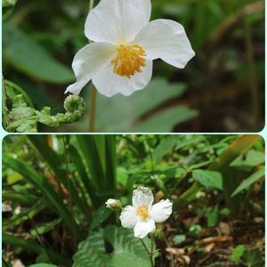 5/12 角田山 ② シャガの軍勢に、勝負を仕掛けている、この娘達は誰ダ⁉️。シャガの群生に群生で対抗しています。ココは杉林の中、この娘の方が新興勢力ですネ。 ⚔️ ⚔️⚔️🛡🛡🛡⚔️⚔️⚔️ シラユキゲシ(白雪芥子) ケシ科シラユキゲシ属の多年草 中国名は血水草、英名はスノーポピー 『中国名の血水草のとおり、茎や花柄などを切ると橙色(紅黄色)の汁が出る』。英名は可愛いのに、中国名はリアルですネ。エッ、英名もそのまんま、確かにその通りです。 ⚔️⚔️⚔️🛡🛡🛡⚔️⚔️⚔️ 中国東部原産です。観賞用でしょうかネ。でも、写真の娘達は野良花化して、シャガと勢力争いを展開中です。ネットを見ていると、近年、各地で野生化の報告が出ています。コリャ、近々、要注意外来種の仲間入りですかネ。 最後にGSからコピペ『逆に育て方を一歩間違えると増えすぎてしまい、迷惑な花となってしまうこともあります。シラユキゲシは、育てることよりもその後の管理の方が大変かもしれませんね』 ⚔️⚔️⚔️🛡🛡🛡⚔️⚔️⚔️
