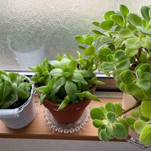 少し前から仲間入りのハオルチアさん😌 ラモサっていうみたい😌かわい🤭 子株ちゃんでてて嬉しいけど、育て方わかってない😳 お水の加減とか勉強しなきゃ💪 右下は、今とっても気になってる子で、 クロトンモドキ・・っていうのかな🤔? ほしいーー😆😆😆