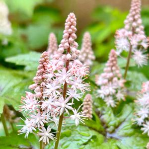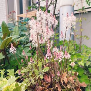 週末に行ったカフェで。 ヒューケラ?なのかな?と思いながらタグ付け🏷️ ↓ ❇︎タグ変えました〜 ひっそりと、ふわふわキラキラ咲いていました🌿
