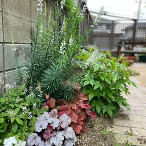 東側の半日陰宿根草花壇。 今の時期は少しだけお日様がさします。 リナリアプルプレア・アルバ ヒューケラ ティアレア ヒューケラ2種はPWさんのもので日陰が好きなタイプのものを植えています😊 風もよく通る場所なので夏にかけては涼しく人間もほっとする場所です♪