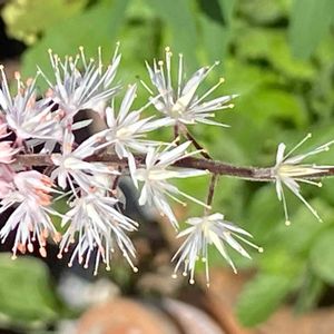 2年目のティアレア 数日前はヒューケラみたいな葉っぱだけでしたが今日お花が咲いてるのを発見😆♪ ふわふわのお花が可愛いです☺️ 耐陰性があり日陰の庭の更に隅っこでも咲いてくれました☺️♪