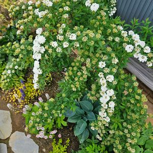 おはようございます☁️ 雨上がりです♪ 白🤍のモッコウバラが咲いてます 去年お迎えし地植えした ティアレア シルベラード オンファロデス♡小花が可愛いです 雨☔を含んだオオデマリ 色の変化を楽しませてくれる グリーンがまだ残ってますね✨ シレネナッキーホワイトさん 雨☔で少し暴れてますが今年も咲いてくれてます。壺型のお花が可愛い🤍