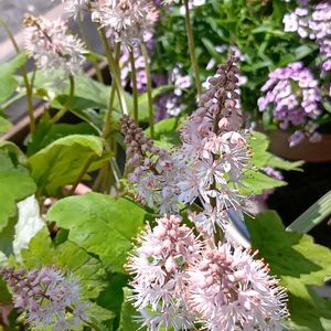 妖精のようで大好きなティアレア、地植えですが毎年よく咲いてくれます🧚✨ ③④ 美しい葉を楽しんでいるアジュガ、可愛い花も咲いて存在感をアピールです🤍💚🩷💜🤎💙🎶