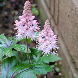 裏庭にも次々と花が咲いてきました😊 ① ヒューケレラ ピンクレボリューション🩷 ヒューケレラとティアレアの交配種! ② ティアレア ③ 斑入り ホウチャクソウ 花後は青黒い実を着けます☺️