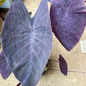 コロカシアブラックマジック 葉が真っ黒になるコロカシアということで買ってから一ヶ月。だんだん黒くなってきたところをパチリ。最初は緑だから普通のサトイモかと思って焦ってたからよかった