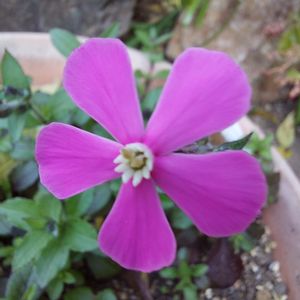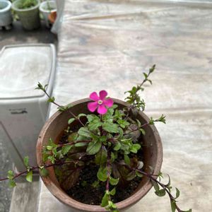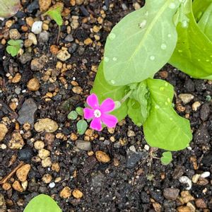鉢植えの土から出てきた葉が花をつけました。調べたら、どうやらツルコザクラみたい。 植えたこともないのに、種が紛れ込んでいたのでしょうか。可愛い風情で、逞しくですね