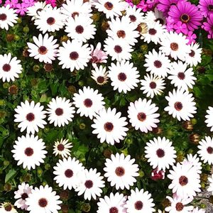 おはようございます🌧 昨日のオステオスペルマム一斉に咲きました🌼💮 黄色とピンクの2色咲きですが、レンズを通すと皆んな同じ白に見えます😥 蕾と花殻の区別がつきにくくなります🙄