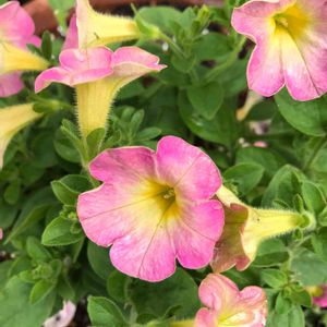 マウントペチュニア・マドンナの宝石(学名: Petunia 英名: Petunia "Madonna's Jewel")の花🌸マドンナの宝石は、マウントタイプのペチュニアです。ピンクイエローは、ピンクとイエローの色合いが可愛らしい小花が多く着き、成長も早く、草姿もまとまるペチュニアです。🌺🌿切戻しを行うことで秋まで開花する長く楽しむことが出来る花です。🌸🌿🌺