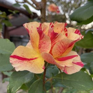 薔薇エドガードガ 絞り模様がくっきり! 同じ木から、色々な模様が楽しめます。もうすぐ12月なのに、我が家の薔薇達は、開花ラッシュです🌹🍃