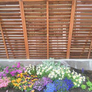 職場の花壇は 建物から滝の様な雨が落ちます 花達を守る為 大きなラティス×3枚、取り付けました。 (私は見てるだけ😅)