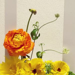 お花屋さんで売ってたミニブーケを使ってみました😊 左下の緑のはなんでしょうね?