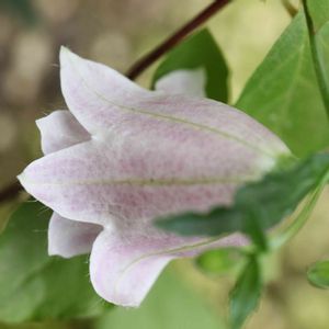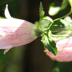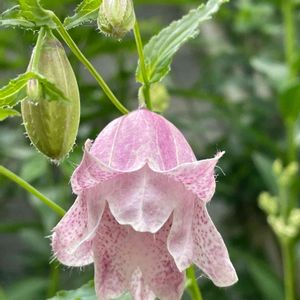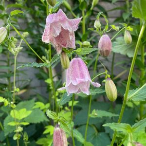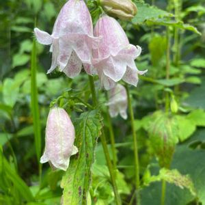 5月28日の投稿と同じ品種で 恐れ入ります (╹◡╹) 前回は晴天の朝の眩しい光の中の 撮影でしたが、この花房の淡い色彩は 今日のような曇天のほうがこの子らしさ が出る気がして、再投稿させて頂きます☺️ 我が家では唯一の二重咲きのホタルブクロ (カンパニュラ・プンクタータ)です😊
