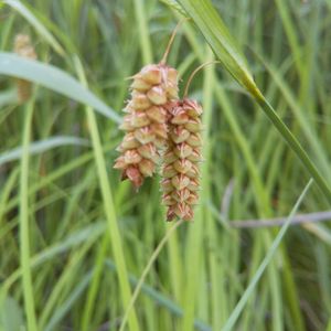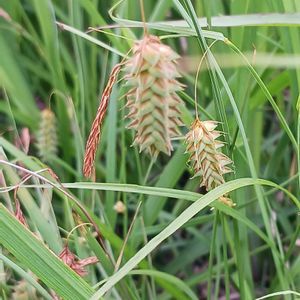 ゴウソ(郷麻) ちょいと地味~~な植物をご紹介。 湿地環境の消失と共に、減りつつある植物。名前がゴツい感じ🦾😂。 湿地に生えるスゲの仲間です。 大きく膨らんで目立つのは、雌小穗(シショウスイ)で、その右側の茶色の細く目立たない線形のが、雄小穗。 5~6月にかけて、ぶら~んぶら~んと垂れ下がった果穗が観られます。 湿地環境が整った自然園で観察しました。