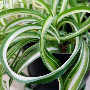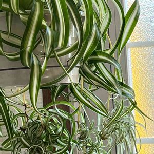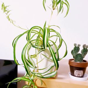 今日のお花 ~オリズルラン~ です💚 ボニーは 葉がツイストし 内側に カールするユニークなオリズルラン🎵 オリズルランは、 ランナーの先に子株が付き、 その姿が折り鶴を下げたように 見えることから この名がつきました。 今も元気ですが、 少し葉焼けしてるので、 過去のpic をupしました🙇♀️💦
