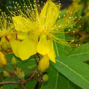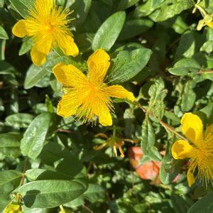 おはようございます♪ ヒペリカムの仲間 オトギリソウ科 ①中央 小坊主弟切(コボウズオトギリ)ヒペリカム・アンドロサエマム 茎は直立し花は1.5〜2cm程でカップ状に咲く、🍃葉は対生 ②西洋金糸梅(セイヨウキンシバイ) ヒペリカム・カリシナム 花は(5〜6cm)広角に開き雄しべが花弁より長く葯が赤色で🍃葉は対生 ③美容柳・未央柳(ビヨウヤナギ) ヒペリカム・モノギナム 花は5cm程で、雄しべは花弁より長く葯が黄色 🍃葉は十字対生 ④金糸梅(キンシバイ) ヒペリカム・パツラム 枝垂れた枝先にうつむきかげんに小さな花(2〜3cm)を咲かせます 🍃葉は2列対生 ⑤大輪金糸梅(タイリンキンシバイ) ヒペリカム・ヒドコート 花は大きく(5〜6cm)花弁先に浅い切れ込みがあり、🍃葉は対生〜十字対生 金糸梅の園芸品種