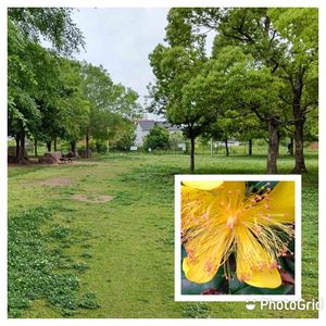 5/17㈪⑤ 上3つがセイヨウキンシバイまたはヒメキンシバイ(ヒペリカムカリシナム) 下2枚が1つ前のpicと同じビヨウヤナギです。 セイヨウキンシバイはオシベの先が全部オレンジまたは赤いです。 オシベは放射状に広がります。 1つの花茎に1つの花が咲きます。蕾が花の近くにありません。 葉は対生です。 メシベはオシベに隠れるくらいの長さで1.2~2cm。目立ちません。 ビヨウヤナギより少し小さいですが、 ヒペリカムアンドロサエマム()赤やピンクの実がなるヒペリカム)よりもずっと大きな花です。
