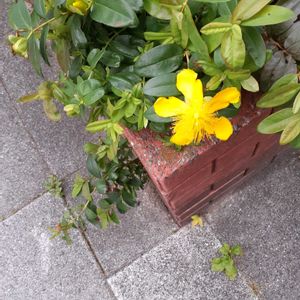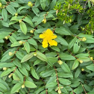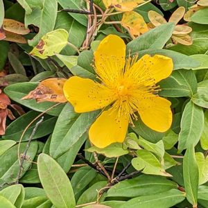 散歩道に咲いてます 💛西洋金糸梅(セイヨウキンシバイ)💛 別名ヒペリカム・カリシナム オトギリソウ科オトギリソウ属 落葉小低木 雄しべが花弁より長く葯が赤色を帯びていて、平開しているのが特徴です 葉は対生しています 今日は雨☔であまり綺麗に撮れなかったのでお天気の日に再度来てみます