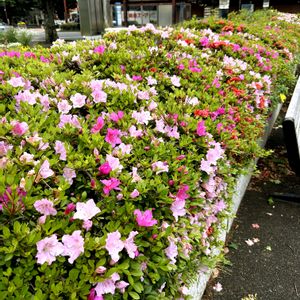 駅前の植え込み ①全体図 この中に ②ツツジ ③八重咲きサツキ ④セイヨウキンシバイ が咲いています🌸🌼 🏷️ピンクワールドへようこそ 🏷️ビタミンカラー 🏷️真っ赤な花 🏷️木に咲く花 に参加させてください🩷💛