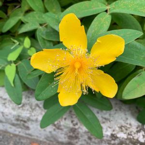 🌸セイヨウキンシバイ(西洋金糸梅)🌸 オトギリソウ科オトギリソウ属常緑小低木 別名 ヒペリカム・カリシナム、姫金糸梅 トルコ、ブルガリアが原産とされる ++++++++++++++++++++++++ 中国伝来の「キンシバイ」に対して、トルコ周辺より伝来したため「セイヨウ(西洋)」と名前がついたそうです。ひとつ前の投稿のビヨウヤナギと区別がつきませんでしたが、よく見ると、ビヨウヤナギの雄しべは上に向かってまばらにぐるんとまつげカールしていますが、セイヨウキンシバイの雄しべは密度があり直線的で放射状に広がっているのですね。 やっと覚えることができました(^^)♪♪