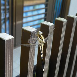 シオカラトンボ💠ブルーは♂でしたので、♀が気になってました♪ 今朝、玄関で迎えてくれたシオカラトンボ♀💛🖤💚 ずーっとジッとしてるので沢ー山撮って、それから手を出してみたらとまってくれました👆🎶💗