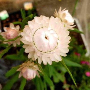 この"ムギワラギク"見た目には写真では分かりませんが、花びらがカサカサしてるんですよ。 秋に種から育ててどんな花が咲くのか分からなかったけど、背丈1mくらいになってこんな感じの花でした。(蕾はほんのりピンクなのに咲くと白くなりました。) 🌸🌸🌸ヾ( 〃∇〃)ツ キャーーーッ♪
