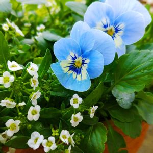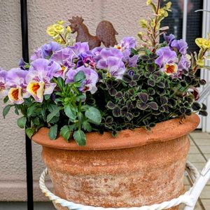 今日は天気が良くて庭仕事日和 買い溜めて置いた苗を寄せ植え 青紫系でまとめてみました ①桂楓園さんのビオラ パスフル《淡青》 青系の滲み色にヤラレテます ②初めての青系シクラメン ドラゴン ライトブルー ③スカビオサ ブルーバルーン ④アリッサムの紫と白を足して 全体像 鉢がハゲハゲですが…😅