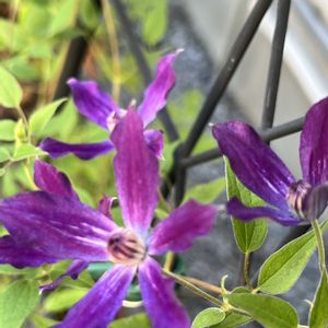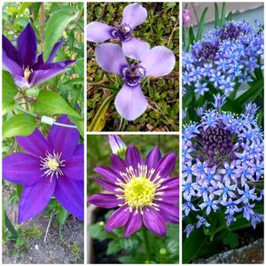 おはようございます☺️ 左・クレマチス💜 3年前、母の日に息子から届いたものを、地植えにしました🤗 毎年咲いてくれています😌 真ん中・チリアヤメ💜、ミヤコワスレ💜は花友さんから、頂きました🎶 右・シラー・ペルビアナ💙💜 ご近所さんで、華やかなお花がたくさん咲いています😄