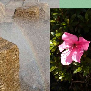 緑の中にポツンとピンクの花、サツキ⁉️ ジプリパークに行きたいわ🤔 いつ行けるかなぁ(笑) 噴水⛲には小さい虹🌈が見えました💞 大きな虹🌈もみたいなぁ〜〜〜🙇