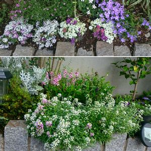 春に色々植えた花壇の今🌼 アリッサムはほとんど白になってしまいましたが、強い子ですね✨