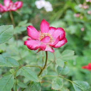 ミニバラあやにしきの花です。 半八重、濃いピンクの縁取りが愛らしい。 花びらが少し硬めで、持ちいいです。 花は少ないけれど、次々咲きます。