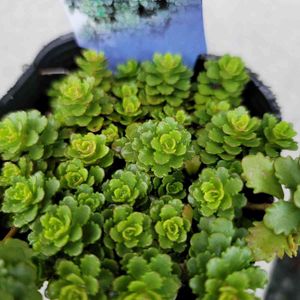 セダム属 ステファニーゴールド フリルのような葉で小さい花のように見えます。 グランドカバー系らしく、地植えも可! 「何がゴールドかって?初夏の花です。」 って札に書いてあるんですが、花、どこ!?