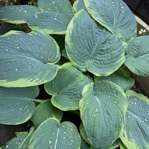 ホスタ フランシスウィリアムズ 3年ほど前に小さなポット苗でお迎えした株で名前がわからないのですが、ネットで画像を調べたら上記かなと思います😃 元々は生け垣の隙間に植えていましたが、3年目を迎えてはっぱが30センチぐらいまで大きくなって芽吹いたので、一旦掘りあげて鉢に避難しました😅模様も色合いもとても綺麗です✨今年は芝生の仕上がりも早く、補修した部分以外はかなり出来上がってきました✌