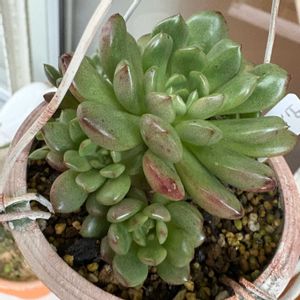 🪴🍀グリーンの多肉 ①ベランダの吊り鉢の ミニベル錦と雷童錦 後ろはピーチネックレスとルビーネックレス ②ピンクルルビー 多肉始めた頃はこの名前 ③フィラティフィラ?だったっけ 空っぽの頭の中駆け巡って探したけどあってるかな? 😁 プラティフィラでした♪ ④上から垂れ下がったエンジェルティアーズ 斑はほとんどなくなってしまいました 下にある放置鉢に根を下ろしてます ちゃっかりしてますね 余談ですがこれを見て我が家の今は亡き🐶の事思い出しました 家の子たちは私と娘でとり上げました 三匹産まれてその中の一匹 この子だけ臍の緒の処理終わってないのに産まれた途端おっぱい吸っていましたね びっくりするやらおかしいやら😄 大きくなってやはり食いしん坊 よく食べ物置いてある所見つけては荒らしてました 高い所に置いてあるのを登ってとっているんです 私が出掛けた時にです 犯人誰だかわからなくてある時出掛けたふりしてそっと見ていたら案の定その子が上手く登っていました🤭 その子はモカちゃん 🐶男の子 エンジェルネックレスの姿に重なりました モカ🐶🐕