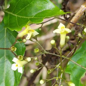 「ハマクサギ」 花は白からクリーム色へ変化する。葉に臭気があるが花は良い香りです。 ➡️小さな子供に見えませんか? (東京都薬用植物園)