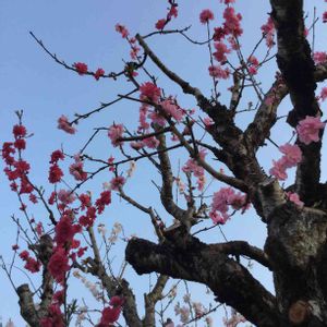 駅に向かう途中の家の花桃 同じ木に3色の花が付いていて とても綺麗です👀✨ 早い時間だとまだまだ薄暗いですね🤳