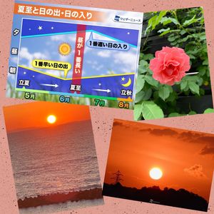 令和4年6月12日(日) おはようございます☁️ 夏至より少し前、 今が「日の出が一番早い」時期! 今年は6月21日に二十四節気「夏至」を迎えます。夏至は一年で太陽が最も空高いところまで昇り、一年の中で昼の時間が最も長くなる日です。 しかし、夏至の日が昼の長さが一番長いからといって、日の出時刻が最も早く、日の入り時刻が最も遅くなるわけではありません! 日の出は少し前、日の入りは少し後が一番に! 左の図は、夏至前後の日の出時刻と日の入り時刻の関係を表した模式図です。 じつは、日の出が最も早いのは夏至の一週間ほど前で、ちょうど今頃が一年の中で最も日の出が早い時期となります。一方、日の入りが最も遅くなるのは夏至の一週間ほど後となっています。夏至はあくまで、昼間の長さ(日の出から日の入りまで)が最も長い日のことなのです。 これは、地球が太陽のまわりを回る面(公転面)に対して自転の軸が傾いていることや、太陽のまわりを回る軌道(公転軌道)が真円形でないことなどが理由です。 日の出が最も早い日と日の入りが最も遅い日は、南へ行くほど差が大きくなり、沖縄付近では10日ほどずれますが、北海道付近では5日ほどしかずれません。ただ、一日で数秒の差なので、実際に私達が変化を感じることは難しそうです。 6月になり、昼間は30℃を超えるような日も増えてきました。ただ、朝早い時間はまだそれほど暑さを感じず、過ごしやすい時期でもあります。夜が明けるのが最も早くなるこの頃、少し早起きをして身の回りのことをいつもより少し早い時間から進めてみるのはいかがでしょうか。 写真:ウェザーリポート(ウェザーニュースアプリからの投稿) ⚠️ウェザーニューズのコピペです⚠️ ⚠️サンセットグロウは2022.06.11 瀬波温泉は2022.04.02 撮影です⚠️