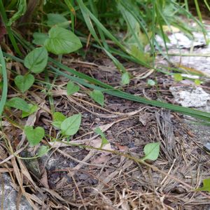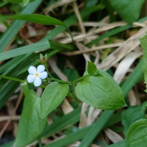 ツルカメバソウ (蔓亀葉草) かな… ムラサキ科キュウリグサ属 5~6月 7~20cm 日本固有種 絶滅危惧ⅠB類 ムラサキ科ですね🩵😊 花は直径約1cm、白色に近い淡青色でした。 葉は互生し葉身は卵形、長さ3~5cm、幅1.5〜2.5cm。先は鋭頭、基部はやや心形~円形。下部の葉には長い葉柄がある。 葉が亀の甲羅を連想させることが亀葉草の名の由来だそうです😊 茎は斜上して1個の花序を出します。 花茎は倒れ.花序直下 の葉腋から走出枝が 出ます。 花冠は5裂し.花筒の上部に黄色っぽい 付属体があります。 今回初めて見かけたのですが、比較的稀な種類なのだそうです。 全体にやわらかく優しい雰囲気の娘でした🥰