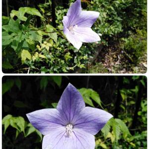 小さい庭に植えた桔梗は、根付かなかったのですが、 家の周りの遊歩道に向かって、裏庭から、一本だけ、チョキンと、茎を伸ばして、桔梗が咲いていました。❇️😄🌈