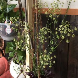 おはようございます 昨夜の突然の雨☔️と風🌪️ オカワカメの鉢に倒れ イタリアンパセリの茎折れる💦 オカワカメの鉢 ケチってダイソーの浅めの鉢にしてしまったのが失敗 本格的に暑くなる前に深い鉢を買いに行って植え替えよう 茎が折れてしまったイタリアンパセリの花は瓶に挿して ポトスたちのハンガーにぶら下げときました😆