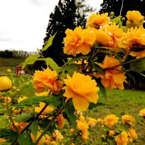 雨上がりの夫実家の庭先 八重 ヤマブキ 前日の冷たい雨に ほとんどの花は散ってしまってましたが 咲いてる姿が見られてよかった😊