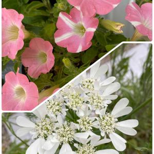 サフィニアももいろハートとオルレア 2年目のサフィニア、咲き始めはピンク一色でハート模様がうまく出ないまま😢 代わりにオルレアが可愛いハートの花びらをたくさん付けて開花🤍 お庭には欠かせないキュートな花