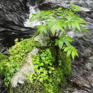 渓流の中の岩に山野草🌱🌿 山野草というより山菜🌱🌿 「ミズ」です。 この時期奥入瀬渓流はミズが沢山生えてます 採ったらダメですよ🌟