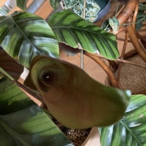 こんにちは。 今日は爽やかな晴天でした🌤️ カラテア ファシアータさんです。 先日、新芽ちゃん3本確認しましたが、もう1本出てきてくれました🌱 カサカサに隠れて見えなかったのですね🧐😅 カサカサ大事☘️ 9/13に肥料(ハイポネックス水)もあげました。 みんな頑張るんだよ🫥💕