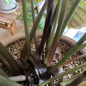 何年か前ダイソーで買ったカラテア・フレディですが…鉢土の表面が盛り上がって化粧砂が溢れてます。 鉢の中、根詰まりというかイモが増えてすごいことになってそう…。この鉢はダイソーのボーダー柄植木鉢で直径13.5センチなので一つ上の16.5センチにこれから植え替えます。植え替え前なので水切ってあって葉っぱ巻いちゃってます。