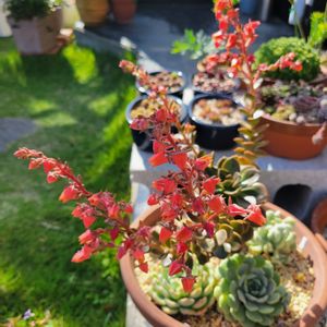 エケベリア丼の真ん中でバンザイしているメラコちゃんにお花が咲いた~これまた華やか 💕*¨*•.¸¸♪\(^^)/•*¨*•.¸¸♪💕 メラコのパワーには😮ビックリ 前pic 4/17